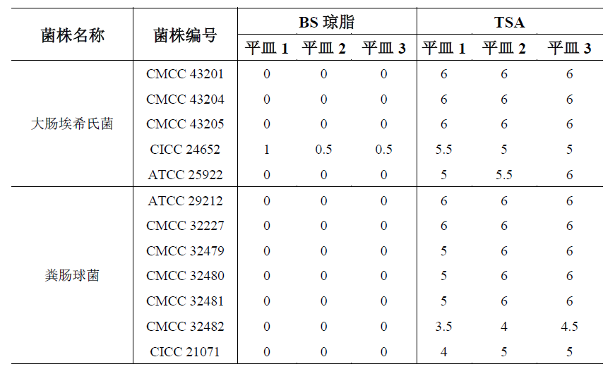 本培養基要求抑制大腸埃希氏菌,避免對沙門(mén)氏菌的分離產(chǎn)生干擾;同時(shí)抑制革蘭氏陽(yáng)性菌-糞腸球菌,故自實(shí)驗室中選取5株大腸埃希氏菌和7株糞腸球菌進(jìn)行驗證。